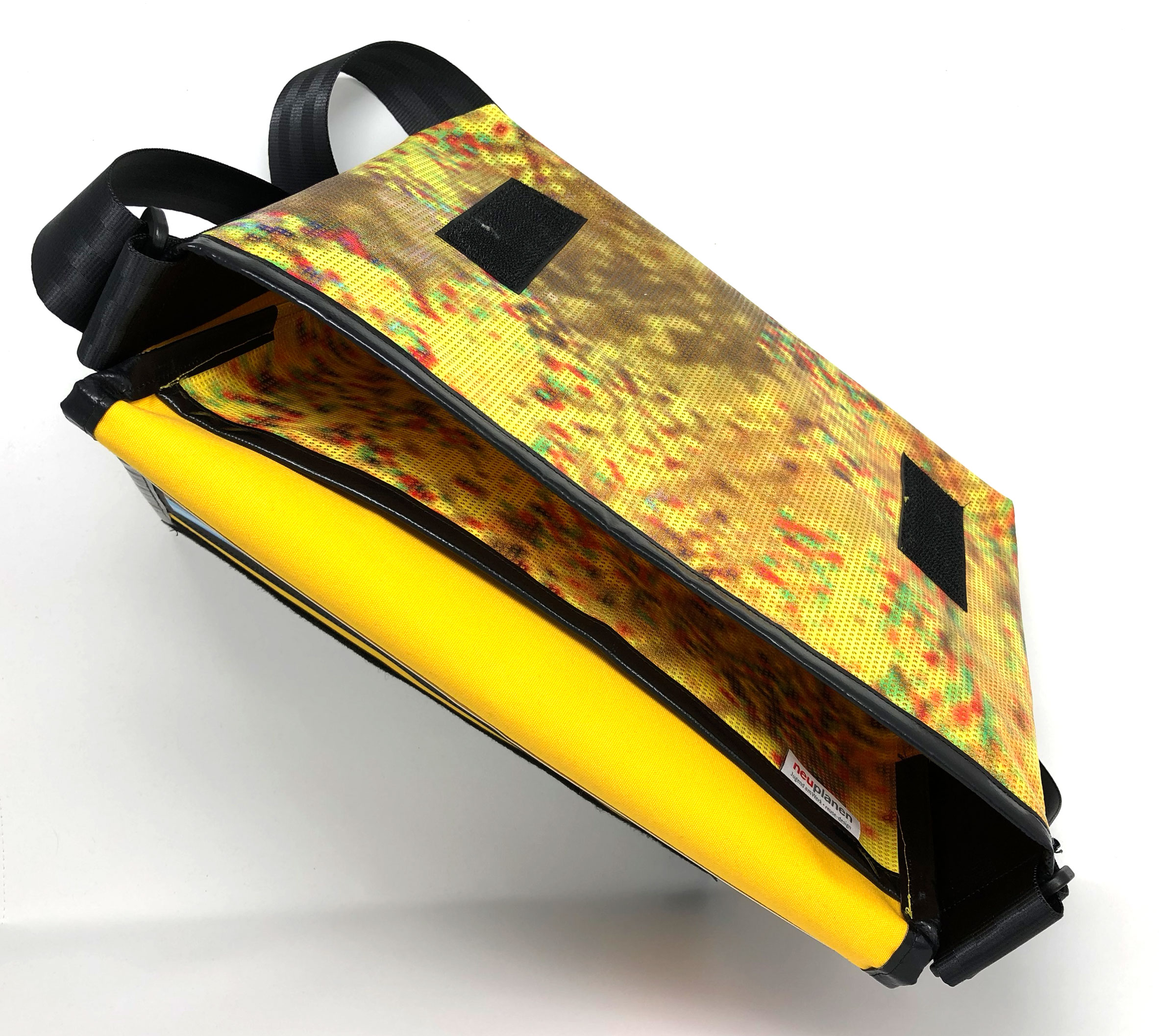 Laptop-Tasche aus PVC Mesh Netzvinyl mit Klettverschluss und Trageriemen. Auf der Innenseite des Taschendeckels ist eine Ansicht des Gesamtwerkes abgedruckt. Die Tasche besteht aus einem verstellbaren Tragegurt (Material: Autosicherheitsgurt), einer Innenfütterung und hat ein zusätzliches Innenfach.