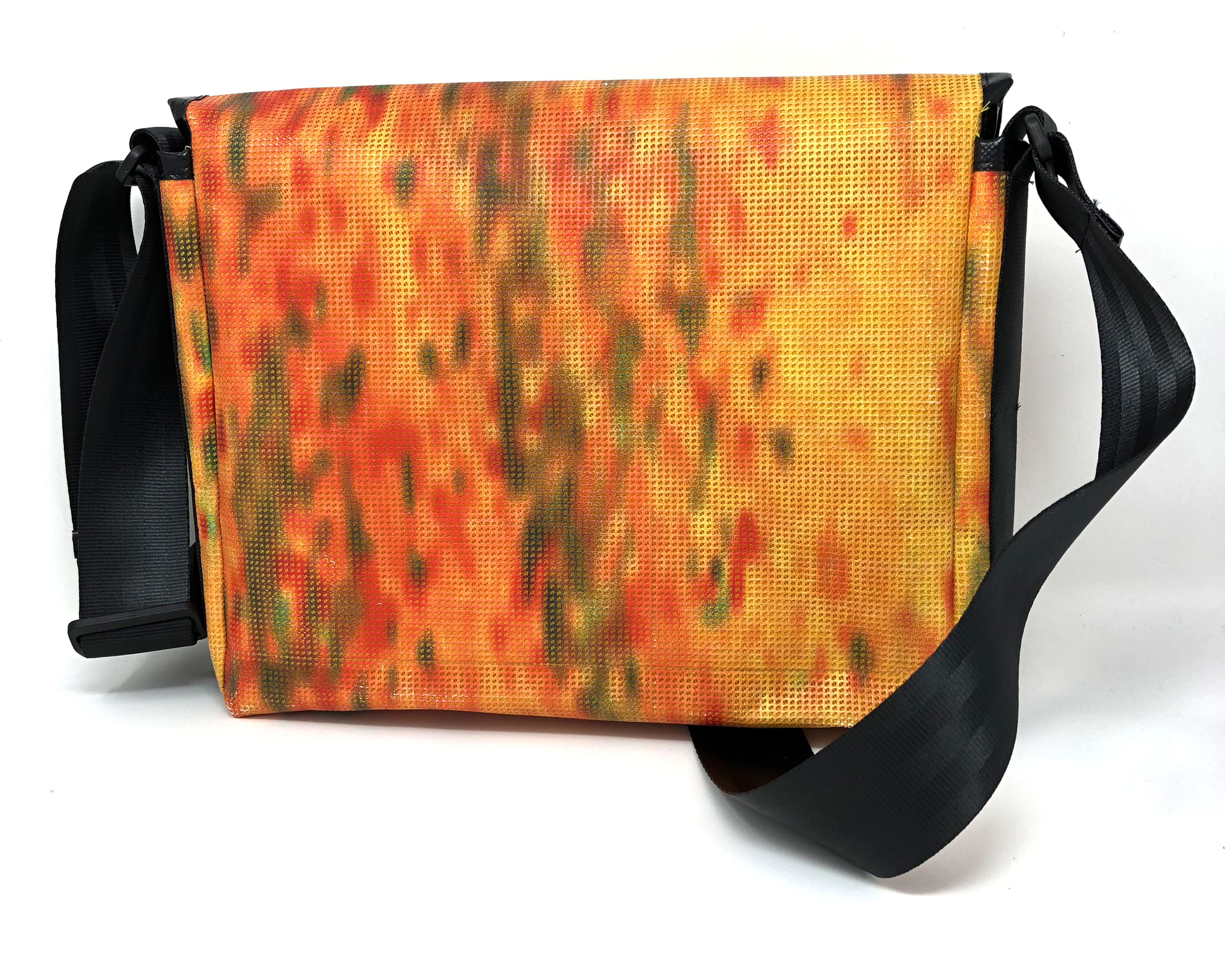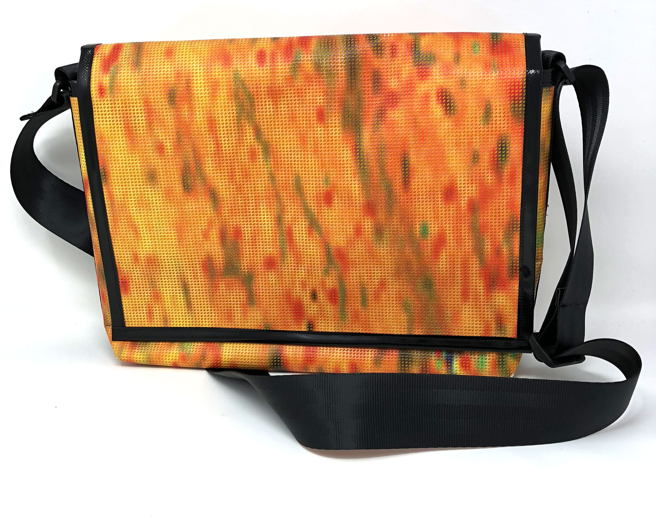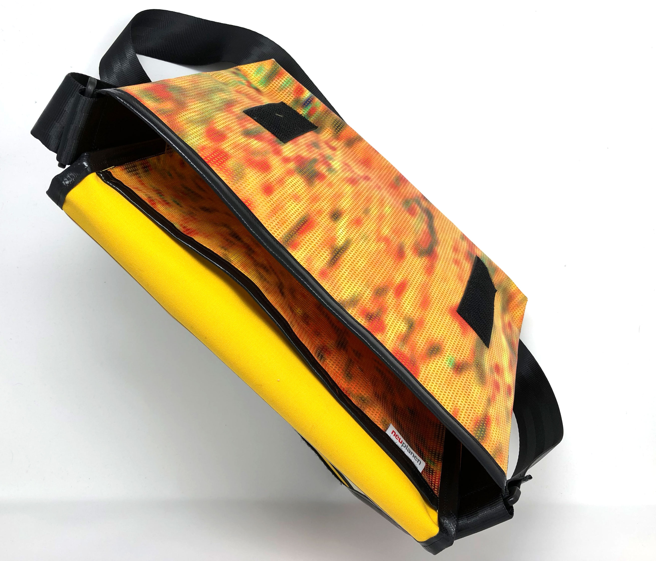 Laptop-Tasche aus PVC Mesh Netzvinyl mit Klettverschluss und Trageriemen. Auf der Innenseite des Taschendeckels ist eine Ansicht des Gesamtwerkes abgedruckt. Die Tasche besteht aus einem verstellbaren Tragegurt (Material: Autosicherheitsgurt), einer Innenfütterung und hat ein zusätzliches Innenfach.