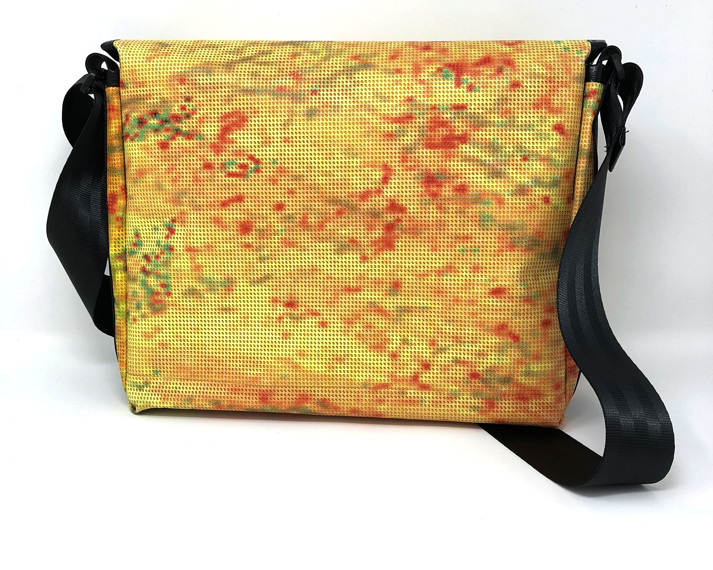 Laptop-Tasche aus PVC Mesh Netzvinyl mit Klettverschluss und Trageriemen. Auf der Innenseite des Taschendeckels ist eine Ansicht des Gesamtwerkes abgedruckt. Die Tasche besteht aus einem verstellbaren Tragegurt (Material: Autosicherheitsgurt), einer Innenfütterung und hat ein zusätzliches Innenfach.