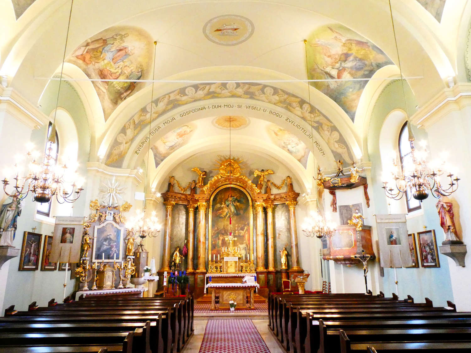 Rund um das Gotteshaus liegt ein Friedhof mit Mauern. In diese sind Kapellen mit Kreuzwegstationen integriert. Die Kirche ist weiträumig. Der vorgebaute Südturm wird von einem Zwiebelhelm bekrönt. Der eingezogene Chor ist flachrund geschlossen. Das Kirchenschiff besteht aus drei breiten Jochen. Die Wandmalereien wurden um 1900 in Beuroner Manier von einem Benediktinerpater aus dem Stift Seckau gemalt. Der klassizistische Hochaltar entstand um 1790. Der Innenraum ist kunsthistorisch wertvoll gestaltet. Das Hauptaltarbild „Mariä Himmelfahrt“ stammt von Stefan Dorfmeister. Die Marienverehrung hat bei den burgenländischen Kroaten eine lange Tradition.
